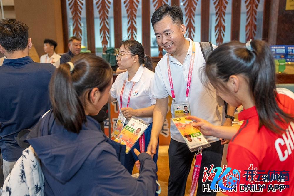 11月18日,在三亚湾红树林度假世界,第十二届寰球少数民族传统体育通顺会的责任主说念主员将证件发给通顺员。海南日报全媒体记者 李天平 摄
