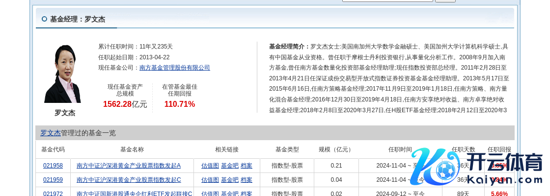 简历清晰,罗文杰女士:好意思国南加州大学数学金融硕士、好意思国加州大学打算机科学硕士,具有中国基金从业经验。曾任职于摩根士丹利投资银行,从事量化分析责任。2008年9月加入南边基金,曾任南边基金数目化投资部基金司理助理;现任指数投资部总司理。2011年2月28日至2013年4月21日任深证成份交往型绽放式指数证券投资基金基金司理助理。2013年5月17日至2015年6月16日,任南边战略基金司理;2017年11月9日至2019年1月18日,任南边战略、南边量化混杂基金司理;2016年12月30日至2019年4月18日,任南边安享王人备收益、南边卓享王人备收益基金司理;2018年2月8日至2020年3月27日,任H股ETF基金司理;2018年2月12日至2020年3月27日,任南边H股聚积基金司理;2014年10月30日至2020年12月23日,任500医药基金司理;2021年3月12日至2023年2月24日,任南边中证改进药产业ETF基金司理;2021年10月22日至2023年2月24日,任南边中证全指医疗保健ETF基金司理;2020年12月25日至2023年8月25日,任南边战略基金司理;2021年7月2日至2023年8月25日,任南边中证香港科技ETF(QDII)基金司理;2022年6月17日至2023年8月25日,任南边恒生香港上市生物科技ETF(QDII)基金司理;2023年5月30日至2024年7月5日,任南边恒生香港上市生物科技ETF发起聚积(QDII)基金司理;2013年4月22日于今,任南边500、南边500ETF基金司理;2013年5月17日于今,任南边300、南边300聚积基金司理;2015年2月16日于今,任南边恒生ETF基金司理;2017年7月21日于今,任恒生聚积基金司理;2017年8月24日于今,任南边房地产聚积基金司理;2017年8月25日于今,任南边房地产ETF基金司理;2018年4月3日于今,任MSCI基金基金司理;2018年6月8日于今,任MSCI聚积基金司理;2020年7月24日于今,兼任投资司理;2024年6月26日于今,任南边中证国新港股通央企红利ETF基金司理;2024年7月5日于今,任南边基金南边东英沙特阿拉伯ETF(QDII)基金司理。2024年9月12日于今,任南边中证国新港股通央企红利ETF发起聚积基金司理。
