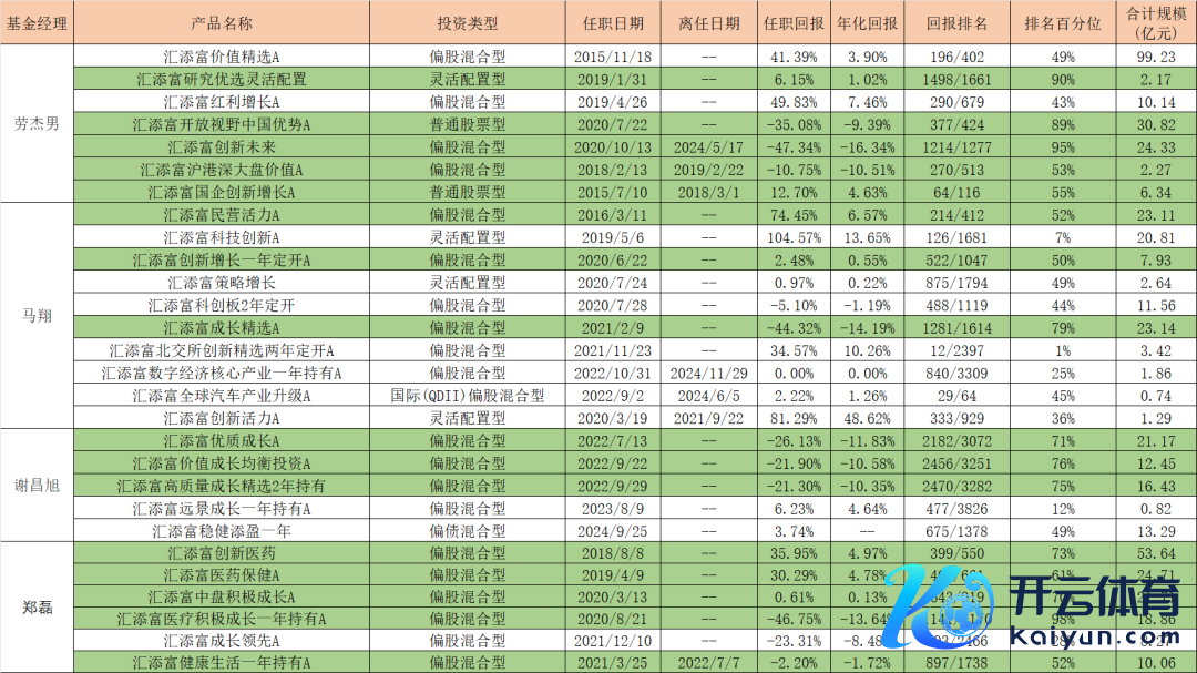 除了胡昕炜之外,劳杰男、郑磊、马翔以及谢昌旭亦然汇添富基金旗下不断边界较大的职权基金司理,上图为上述基金司理在管基金以及卸任基金的任期功绩汇总,绿色标注为基金司理任期功绩名次在50%以下的基金,4位基金司理在管或卸任基金整个28只,16只基金名次在50%之外,还有10只在70%之外,如斯功绩与“选股众人”的称呼显得极不格外。