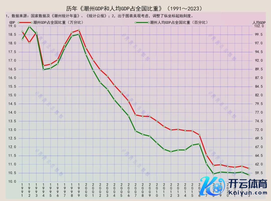 1991年以来,不论是GDP占宇宙的比重,如故东说念主均GDP占宇宙平均值的比例,潮州的下滑趋势齐是肉眼可见的。