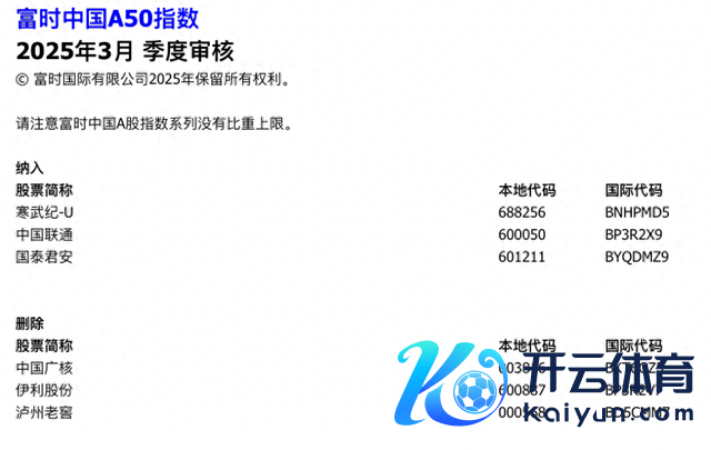 说明审核后果,市集眷注度最高的富时中国A50指数本次将纳入寒武纪(688256)、中国联通(600050)以及国泰君安(601211)。同期,中国广核(003816)、伊利股份(600887)、泸州老窖(000568)将被剔除。